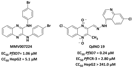 Indeed, several quinoxalines have already been described as promising antiplasmodial molecules, including MMV007224 (Figure 2), which was identified from the Malaria Box [10]. In addition, the 1,4-di-N-oxide quinoxaline derivative (QdNO 19) showed antiplasmodial activity against both the 3D7 chloroquine-sensitive and FCR-3 multidrug-resistant strains of P. falciparum [11].