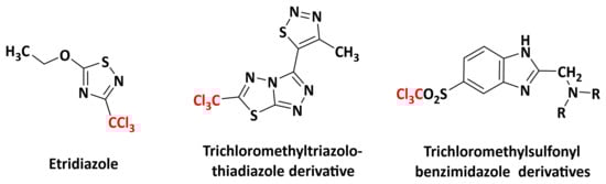 It is noteworthy that some trichloromethylated molecules were known as biocides, such as etridiazole (Figure 3) [21] and trichloromethyltriazolothiadiazole, which target pyruvate kinase II located in the apicoplast [22]. In addition, Banach et al. described trichloromethylsulfonylbenzimidazole derivatives with herbicidal activities targeting the apicoplast [23]. Therefore, a possible correlation between the pharmacophore -CCl3 and herbicidal activity could be suggested.