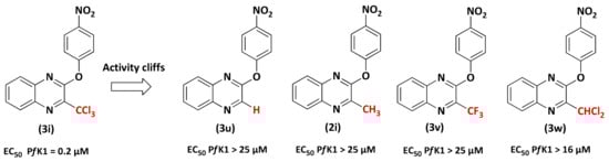 Previously, we have shown that the CCl3 group is mandatory to provide antiplasmodial activity [28,29,30]. To confirm the key role played by the 3-CCl3 group of the most potent compound (3i) in phenoxyquinoxaline series, the CCl3 group was replaced by a proton (3u), a CH3 group (2i), a CF3 group (3v), and a CHCl2 group (3w). All these analogs without the CCl3 group lost their activity against P. falciparum (EC50 PfK1 > 16 µM). Once again, the CCl3 group appeared essential for antiplasmodial activity (Figure 4) [31].