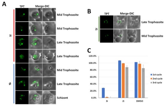 To determine the impact of (3i) on apicoplast biogenesis, parasites were treated for 48 h with 0.2 µM of (3i) or 0.2 µM of (2i) (a control of (3i) for which the active CCl3 was replaced by a methyl CH3 group) and compared to untreated parasites by immunofluorescence assay. In the untreated culture, parasites presented normal apicoplast biogenesis depending on the life stage (elongated for trophozoite stage and individualized for schizont) while treated culture with (3i) showed a doted single non-elongated apicoplast at the mid-trophozoite life stage and apicoplast, which seems to diffuse into the cytosol and form vesicles for advance life stages (i.e., late trophozoite) (Figure 5A). This result is similar to what was previously reported after parasite chemical rescue after apicoplast loss [32]. We confirmed the absence of effect of molecule (2i) on the apicoplast biogenesis and Plasmodium growth, correlated to the replacement of the CCl3 group of (3i) by CH3 (Figure 5B,C). In order to determine if the apicoplast is the main target of (3i), we performed a growth assay over three life cycles to assess a potential delayed death effect, one of the major signature for compounds affecting apicoplast. The results show a drastic reduction in the parasite growth within the first life cycle in the cultures treated with 0.2 µM of (3i) (Figure 5C), which can be interpreted in two ways: the first is that the primary target is outside of the apicoplast and the impact on apicoplast biogenesis is a collateral effect. The second interpretation could be that, unlike chloramphenicol or doxycycline, which cause a delayed death phenotype on Plasmodium, (3i) could act like fosmidomycin or actinonin and cause a rapid death phenotype [31]. Hence, although, we cannot exclude an indirect effect on the apicoplast, (3i) affects its presence and morphology.