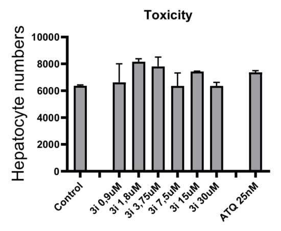 The effect of (3i) on the hepatic stage of P. falciparum was next studied in order to know if (3i) was active against another stage of P. falciparum cycle. Cryopreserved primary human hepatocytes were infected with 30,000 freshly extracted P. falciparum sporozoites and simultaneously treated with a dose range (0.9–30 µM) of (3i). Atovaquone (ATQ) was used as a positive parasite-killing control at 25 nM. Treatment with (3i) had no effect on exoerythrocytic forms (EEF or schizont) size and numbers at 6 or 12 days post-infection, while ATQ could completely clear all parasites from the culture (see Supplementary Materials Figures S50 and S51). The apicoplast in the hepatic stage was quite not affected by (3i) even at high concentrations (up to 30 µM) (see Supplementary Materials Figure S52).