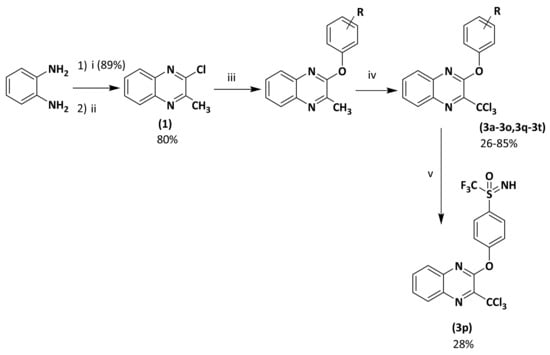 Preparation of 2-phenoxy-3-trichloromethylquinoxaline derivatives (3a–3t). Reagents and conditions: (i) ethyl pyruvate 1 equiv, H2O, 50 °C, 15 min; (ii) POCl3, reflux, 2 h; (iii) appropriate phenol derivative 1 equiv, Cs2CO3 1 equiv, anh. DMF, 70 °C, 12 h, sealed vial, N2; (iv) PCl5 6 equiv, POCl3 as solvent, 100 °C, MW, 20 min, 800 W; (v) (3m) 1 equiv, ammonium carbamate 1.5 equiv, phenyliodine diacetate 2.1 equiv., CF3CH2OH, rt, 3 h.