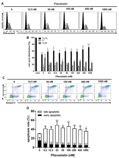 Cells treated with Pitavastatin at varying concentrations were centrifuged at 200× g for 5 min, at room temperature. After aspirating the medium, cells were resuspended in cold PBS/1% BSA. The cells were then fixed in 70% ethanol, while vortexing, and stored at −20 °C for 2 h. Before analysis, cells were washed two times at 200× g, for 10 min, at room temperature, to remove the ethanol. Cells were rinsed twice with PBS/1% BSA and stained for 15 min with 1 μg/mL PI/RNase staining solution (BD Biosciences, Franklin Lakes, NJ, USA). The samples were measured by FACSCalibur (BD Biosciences). The percentage of cells at each cell-cycle phase was quantified by fitting the experimentally obtained histogram with the Dean–Jett–Fox model in FlowJo software version 7.6.4 software (Treestar Inc., Ashland, OR, USA) (n = 4 independent experiments).