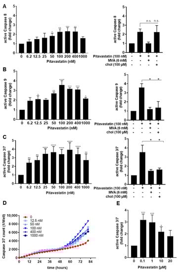 To investigate the kinetics of Pitavastatin-induced apoptosis, we next monitored the signal of a specific green fluorescent dye for caspase-3/7 enzyme activity by IncuCyteS3® live cell imaging over a period of 82 h (Figure 3D). Pitavastatin induced an increase in caspase-3/7 activity after 50 h, indicating a delayed apoptotic mechanism. Here, we observed the highest caspase-3/7 induction at a concentration of 100 nM Pitavastatin, whereas higher concentrations attenuated the caspase expression. To further validate this effect, we treated cells with increasing Pitavastatin concentrations up to 20 µM. We noticed that the caspase-3/7 expression was highest at the lowest Pitavastatin concentration of 100 nM (Figure 3E). Taken together, these data suggest that Pitavastatin induced apoptosis, especially at lower concentrations.