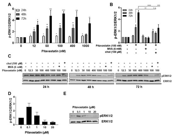 To elucidate the mechanism of Pitavastatin-induced apoptosis, we investigated the potential role of MAPK signaling. The expression and activation of ERK1/2 were measured by Western blot after exposure of human freshly stimulated T cells to Pitavastatin over a period of 24 to 72 h (Figure 4A,C). Interestingly, we detected a strong phosphorylation of ERK1/2 in the presence of Pitavastatin. As shown in Figure 4A, ERK1/2 phosphorylation was already slightly increased after 24 h incubation (1.25-fold at 100 nM Pitavastatin) and even more clearly detectable after 48 h. Highest ERK1/2 phosphorylation was observed after 72 h at a concentration of 100 nM (5.2-fold). When cells were co-incubated with Pitavastatin and MVA, the ERK1/2 phosphorylation was entirely reversed. Addition of cholesterol led to a partial reduction of ERK1/2 phosphorylation (Figure 4B). These results were surprising, because several reports described the opposite phenomenon of reduced ERK1/2 phosphorylation in different cell systems [,,]. To compare our experimental setting with data published in the previous reports applying much higher statin concentrations, we incubated freshly stimulated T cells with 100 nM Pitavastin, as well as with concentrations of 10 and 20 µM. ERK1/2 phosphorylation was analyzed after 48 h (Figure 4D,E). As expected, the ERK1/2 phosphorylation was increased after incubation of T cells with 100 nM Pitavastatin. Indeed, we observed that, in T cells incubated with high Pitavastatin concentrations, the ERK1/2 phosphorylation was reduced (0.3-fold at 20 µM Pitavastatin). Taken together, these data show that Pitavastatin induces ERK hyperphosphorylation at low nanomolar concentrations and suppresses ERK phosphorylation at concentrations of 10 µM and higher.