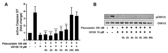 To determine whether the strong phosphorylation of ERK is responsible for the observed increased apoptosis in Pitavastatin-treated T cells, we used the specific MEK1/2 inhibitor U0126 to prevent ERK1/2 phosphorylation. Therefore, T cells were stimulated with CD3/CD28 antibodies and incubated with 100 nM Pitavastatin. The MEK inhibitor was added at different time points upon stimulation (0, 2, 4, 6, 8, 24 and 48 h), and the phosphorylation of ERK1/2 and active caspase-3/7 were analyzed 72 h upon stimulation. As shown in Figure 5A, treatment with Pitavastatin for 72 h induced caspase-3/7, as expected. This effect was clearly reduced when U0126 was added at early time points up to 8 h. Treatment with U0126 alone showed no effect on caspase-3/7 expression. The addition of the inhibitor 24 or 48 h after stimulation did not prevent induction of apoptosis. As shown in Figure 5B, phosphorylation of ERK1/2 was effectively prevented by U0126 at all timepoints. These results suggest that low doses of Pitavastatin induce apoptosis through sustained activation of pro-apoptotic ERK.