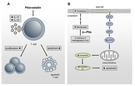 Schematic presentation of the functional effects of Pitavastatin on T cells. (A) Pitavastatin inhibits proliferation in freshly stimulated and pre-activated T cells. Inhibition of proliferation was associated with reduced IL-17 and IL-10 secretion and apoptosis induction. (B) By inhibiting HMG-CoA reductase, the cholesterol concentration in the lipid rafts is reduced, leading to hyperphosphorylation of ERK1/2. Sustained activation of ERK1/2 induces the activation of caspase-9 and caspase-3/7, leading to cell death.