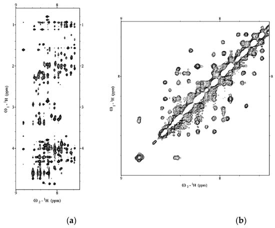 (a) Low field and (b) high field regions of 2D NOESY of Aβ(1–42) acquired on Bruker 600 MHz NMR in HFIP/water 50/50 v/v.
