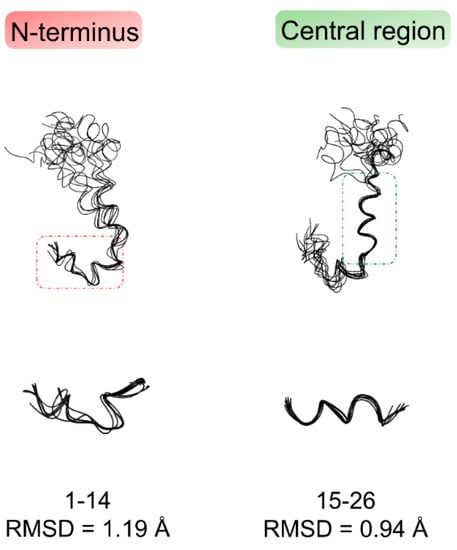 Figure 3 shows the bundle of the best 10 Aβ(1–42) NMR structures derived from simulated annealing calculation using CYANA software [30]. The structures, deposited in the Protein Data Bank with the accession code PDB ID: 6SZF, are superimposed on the backbone heavy atoms of 1D–H14 N-terminal residues and 15Q–S26 central residues, showing a root mean square deviation (RMSD) of backbone atom position of 1.19 Å and 0.94 Å, respectively; on the contrary, as predicted from analysis of NOE data, the C-terminus is much more disordered and dynamic.