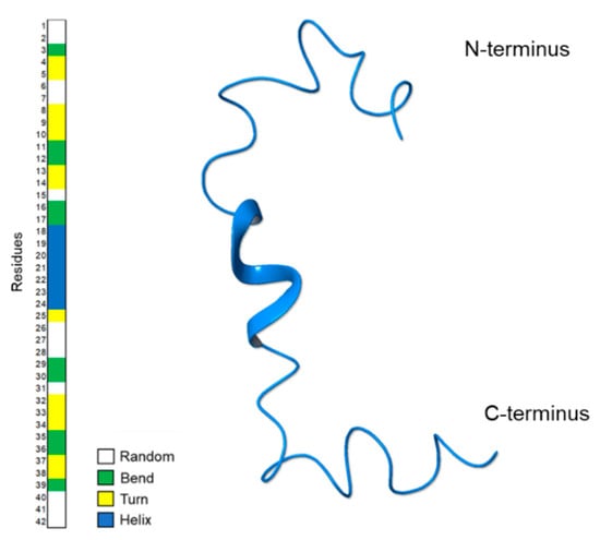 Based on the amyloid-β (Aβ) cascade hypothesis, abnormal accumulation of the Aβ peptides into toxic extracellular plaques is critical for inducing neurodegeneration and dementia in AD patients [9,41,42,43]. The main components of the amyloid plaques are Aβ(1–40) and Aβ(1–42), soluble helical peptides that, in overcoming toxic environmental conditions, undergo a conformational transition to form β-sheet oligomers, protofibrils, fibrils, and plaques [42]. How this transition occurs is still questioned. Experimental data on this process are derived from NMR studies of the peptide before and after the α-helix-β-sheet conformational transition, i.e., in solution [21,23] and the solid state [44,45]. Little data are available on the prevalent Aβ(1–42) conformations occurring in the intermediate steps of helical-to-sheet transition.