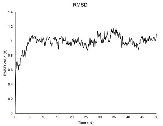 Calculations were run with GROMACS [32,38]. The best NMR structure based on the lowest value of the target function (CYANA 2.1 [30]) was positioned in a box filled with explicit water for 50 ns at 298 K. As shown by the RMSD plot, the system reaches equilibrium after 1 ns and is stable during the whole simulation (Figure 5) [39].
