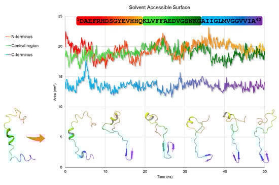 The snapshots of the 50 ns MD trajectory of Aβ(1–42) in water are shown in Figure 6, overlapped to the solvent-accessible surface area (sasa) plot. As reported, the 18V–V24 α-helical structure slides to the 12V–V18 portion during the first steps of the dynamics, experimenting unfolding after 40 ns. Remarkable is the β-sheet architecture formed at C-terminus 27N–I41, which turns out to be extended to three strands within the 18 to 28 ns time range. Confirming data previously published [40], this is a crucial step for amyloid seeding, which is known to originate in the neighborhood of the 25G–M35 residues. From 28.1 ns to the end of MD simulation, this strand gets confined in residues 35M–V40, indicating that the fibrillation is occurring, and the β-strand is transforming into a more complex intermolecular structure. Solvent-accessible surface data (GROMACS sasa, Figure 6) support this interpretation and show that N-terminal and central regions are equally exposed to the solvent until 40 ns, when the central part has low solvent accessibility because it is shielded by the N-terminal segment.