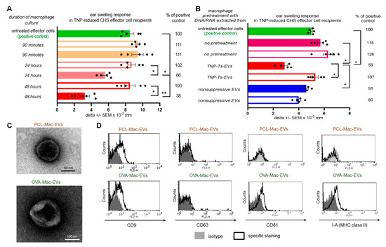 Macrophages treated with Ts-EVs release inhibitory Mac-EVs that differ in marker’s expression pattern depending on mouse immunizing antigen. (A) Macrophages, after 30 min treatment at 37 °C with TNP-Ts-EVs, were cultured in protein-free MDM medium. Yielded supernatant was collected 90 min, 24 h or 48 h later, filtered and ultracentrifuged, and resulting fractions (i.e., pellet–filled bars; and supernatant above–open bars) were used to treat CHS effector cells prior to their transfer into naive recipients (n = 5 per group) that were immediately challenged with hapten to elicit CHS reaction, measured as ear swelling 24 h later. (B) Untreated macrophages or macrophages treated for 30 min at 37 °C with DNA/RNA extracted from either TNP-Ts-EVs or control, non-suppressive EVs, were cultured in protein-free MDM medium for 48 h. Yielded supernatant was filtered and ultracentrifuged, and resulting fractions (i.e., pellet–filled bars; and supernatant above–open bars) were used to treat CHS effector cells prior to their transfer into naive recipients (n = 5 per group) that were immediately challenged with hapten to elicit CHS reaction, measured as ear swelling 24 h later. (C) PCL-Mac-EVs (produced by TNP-Ts-EV-treated macrophages from PCL-sensitized mice) and OVA-Mac-EVs (produced by OVA-Ts-EV-treated macrophages from OVA-immunized mice) were absorbed onto cupper grid, negatively stained with 3% uranyl acetate, and visualized with TEM microscope. (D) PCL-Mac-EVs and OVA-Mac-EVs were coated onto latex beads, stained with fluoresceinated antibodies against selected EVs’ markers, including CD9, CD63, CD81 tetraspanins and I-A molecules, and analyzed with flow cytometry. Data are expressed as delta ± SEM. One-way ANOVA with post hoc RIR Tukey test; * p < 0.05, ** p < 0.01.