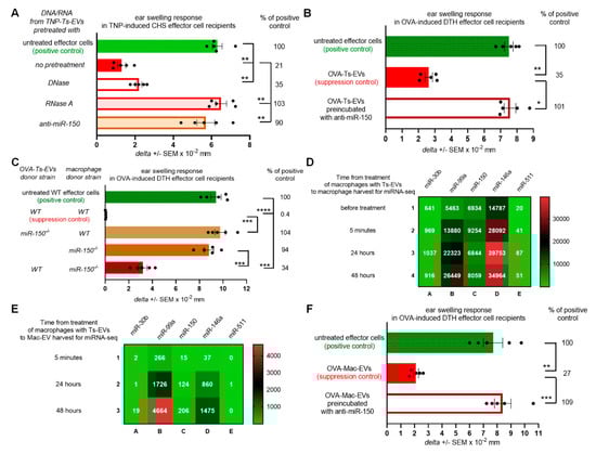 Ts-EV-treated macrophages release Mac-EVs inhibiting DTH in miRNA-150-dependent manner. (A) CHS effector T cells and macrophages were incubated with TNP-Ts-EV-extracted DNA/RNA pretreated with DNase, RNase A or anti-miR-150, and then adoptively transferred to naive recipients (n = 5 per group) that were immediately challenged with hapten to elicit CHS reaction, measured as ear swelling 24 h later. (B) DTH effector T cells and macrophages were incubated with OVA-Ts-EVs, where indicated pretreated with anti-miR-150, and then adoptively transferred to naive recipients (n = 5 per group) that 24 h later were challenged with OVA to elicit DTH reaction, measured as ear swelling 24 h later. (C) DTH effector cells were treated with either OVA-Mac-EVs from wild type mice, EVs from macrophages treated with OVA-Ts-EVs from miRNA-150−/− mice, EVs from untreated miRNA-150−/− mouse macrophages, or with EVs from miRNA-150−/− mouse macrophages treated with OVA-Ts-EVs from wild type mice. Twenty four hours later recipients of adoptively transferred DTH effector cells (n = 5 per group) were challenged with OVA to elicit DTH reaction, measured as ear swelling 24 h later. (D) RNA extracts from untreated macrophages or macrophages treated with OVA-Ts-EVs were subjected to miRNA deep sequencing (n = 1 per time-point). (E) RNA extracts from OVA-Mac-EVs collected from 5 min-, 24 h- or 48 h- macrophage culture supernatant were subjected to miRNA deep sequencing (n = 1 per time-point). (F) DTH effector cells were incubated with OVA-Mac-EVs, where indicated pretreated with anti-miR-150, and then adoptively transferred to naive recipients (n = 5 per group) that 24 h later were challenged with OVA to elicit DTH reaction, measured as ear swelling 24 h later. Data are expressed as delta ± SEM. One-way ANOVA with post hoc RIR Tukey test; * p < 0.05, ** p < 0.01, *** p < 0.005, **** p < 0.001.