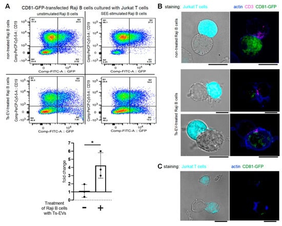 For flow cytometric analysis of cells after formation of conjugates, CD81-GFP-transfected Raji B cells were pulsed with Staphylococcal enterotoxin type E (SEE) superantigen (0.5 µg/mL) for 30 min at 37 °C and, after washing, were cultured with Jurkat T cells for 24 h in the presence of OVA-Ts-EVs. Afterwards, cells were stained with fluoresceinated antibodies against CD19 (also allowing to distinguish CD19neg T cells). A viability staining was performed as well with Ghost Dye V510 (TONBO Biosciences, San Diego, CA, USA). Cells were analyzed in a FACS Canto II (BD Bioscience, San Jose, CA, USA) and then FCS files were analyzed in FlowJo software [55].