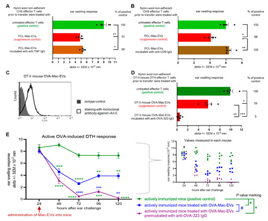 Antibodies modulate the suppressive activity of PCL- and OVA-Mac-EVs. (A) CHS effector T cells were incubated for 30 min at 37 °C with PCL-Mac-EVs, where indicated pre-incubated with anti-TNP IgG antibodies. Afterwards, CHS effector T cells were adoptively transferred to naive recipients (n = 5 per group) that were immediately challenged with hapten to elicit CHS reaction, measured as ear swelling 24 h later. (B) CHS effector T cells were incubated for 30 min at 37 °C with PCL-Mac-EVs, where indicated pre-incubated with anti-CD9 IgG antibodies. Afterwards, CHS effector T cells were adoptively transferred to naive recipients (n = 5 per group) that were immediately challenged with hapten to elicit CHS reaction, measured as ear swelling 24 h later. (C) OT-II mouse OVA-Mac-EVs were coated onto latex beads, stained with fluoresceinated antibodies against I-A/I-E molecules, and analyzed with flow cytometry. (D) DTH effector T cells from OVA-immunized OT-II mice were incubated for 30 min at 37 °C with OT-II mouse OVA-Mac-EVs, where indicated pre-incubated with anti-OVA-323 IgG antibodies, and then were adoptively transferred to naive wild type recipients (n = 5 per group) that 24 h later were challenged with OVA to elicit DTH reaction, measured as ear swelling 24 h later. (E) After measuring of 24-h DTH ear swelling, actively immunized C57BL/6 mice (n = 5 per group) were administered intraperitoneally with OT-II mouse OVA-Mac-EVs alone or preincubated with anti-OVA-323 IgG antibodies, and subsequent DTH ear swelling was measured up to 120 h after challenge. Data are expressed as delta ± SEM. One-way or two-way ANOVA with post hoc RIR Tukey test; * p < 0.05, ** p < 0.01, *** p < 0.005, **** p < 0.001, # p < 0.05, ## p < 0.01, ### p < 0.005, #### p < 0.001.