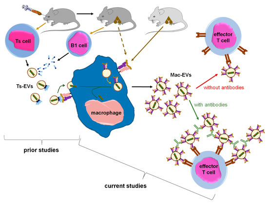 Shortly after the discovery of suppressor T (Ts) cells, one of their subpopulations was shown to inhibit mouse hapten-induced contact hypersensitivity (CHS) reaction by generating so-called T suppressor factor (TsF) [5,6]. Our recent research uncovered that TsF consists of miRNA-150 carried by EVs, hereinafter called Ts-EVs. Those downregulate both hapten-induced CHS [5,7,8], and delayed-type hypersensitivity (DTH) to protein antigens, such as ovalbumin (OVA) [9], and casein [10]. Both miRNA-150 and Ts-EVs are produced by CD8+ Ts cells, not expressing FoxP3, and activated through the intravenous administration of syngeneic red blood cells coupled with hapten or protein antigen [5]. Interestingly, Ts-EVs are surface coated with antigen-specific antibody light chains derived by B1a cells activated by skin immunization [7,11]. This ensures the antigen specificity of immune suppression mediated by Ts-EV-delivered miRNA-150 [12].
