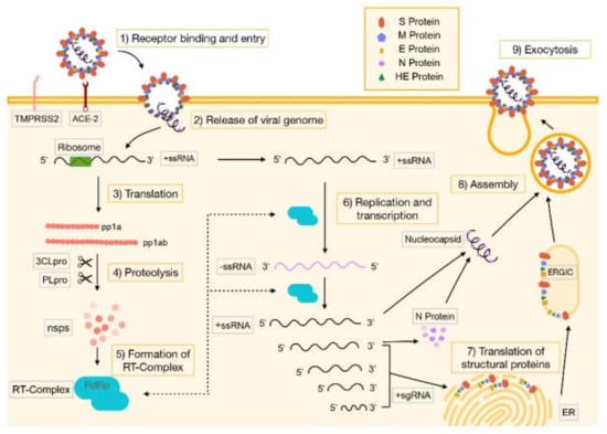 - V’Kovski, P.; Kratzel, A.; Steiner, S.; Stalder, H.; Thiel, V. Coronavirus biology and replication: Implications for SARS-CoV-2. Nat. Rev. Genet. 2021, 19, 155–170. [Google Scholar] [CrossRef]