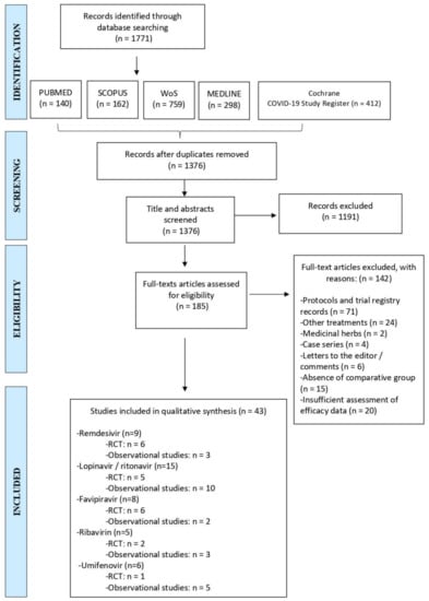 The studies have been identified by combining the name “coronavirus”, “COVID-19” and “SARS-CoV-2” with the following keywords: lopinavir/ritonavir, remdesivir, favipiravir, umifenovir, ribavirin or their respective trade names. MeSH terms (Medical Subject Headings) and the Boolean operators “AND’’ and ‘’OR’’ have also been used in the search.