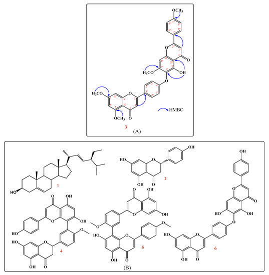 Compound (3) is a new biflavonoid, and the 1H-NMR of 3 established the presence of only one hydroxyl group that resonated at δ 13.12, indicating the presence of one chelated hydroxyl at the 5″ position. The 1H-NMR spectrum also showed two sets of the AA′BB′ systems as indicated by δ 7.48 (2H, d, J = 8.5 Hz) for H-2‴, 6‴, δ 6.84 (2H, d, J = 8.5 Hz) for H-3‴, 5‴ and 7.88 (2H, d, J = 8.5 Hz) for H-2′, 6′, and δ 7.18 (2H, d, J = 8.5 Hz) for H-3′, 5′. The presence of two meta-coupled doublets (J = 2.5 Hz) each due to the one proton in the upfield aromatic region at δ 6.36 and 6.44 was ascribed to the H-6 and H-8 protons, respectively. Moreover, the three-singlet signals at δ 6.54, 6.61, and 6.66 were assigned to H-8″, H-3″, and H-3, suggesting the biflavonoid linkage between 4′-OH and 6″. The 1H-NMR spectrum revealed a hinokiflavone pattern (a diaryl ether-type biflavonoid) with four aromatic methoxy signals at δ 3.79, 3.81, 3.84, and 3.86, suggesting tetra-O-methyl derivatives. The 13C-NMR spectrum further confirmed the biflavonoid structure from the presence of 30 carbons in addition to four methoxy signals at δ 56.33, 55.94, 55.79, and 55.48 ppm. The 13C-NMR spectrum showed the presence of one signal at δ 92.62 and two signals at δ 98.15 and 95.43 assigned to C-8, C-6, and C-8″, respectively. This implies that C-6″ is involved in the interflavonoid linkage, which also confirmed the hinokiflavone pattern [11]. Hinokiflavone O-methylation affects the shift of ortho- and para-atoms, as the 13C-NMR spectrum revealed a downfield shift in C-10, an upfield shift in C-8 indicating 7-O-methoxylation, a downfield shift in C-10″, and an upfield shift in C-8″ indicating 7″-O-methoxylation. While there was an upfield shift in C-3‴, 5‴, there was a downfield shift in C-1‴, indicating 4‴-O-methoxylation compared with hinokiflavone (6) [12]. The tetra-O-methyl-hinokiflavone structure confirmed with HMBC correlations from OCH3-7 at δ 3.86 to C-7 at δ 162.52, from OCH3-7″ at δ 3.84 to C-7″ at δ 157.70, from OCH3-4‴ at δ 3.81 to C-4‴ at δ 160.65, from OCH3-5 at δ 3.79 to C-5 at δ 162.11, and from OH-5″ at δ 13.12 to C-6″ at δ 123.34 and C-10″ at δ 105.52 [13]. All correlations are displayed in Figure 1A. The ESI-MS spectrum of this compound showed ion at m/z 593.3633 [M-H]− which matches with the determined structure. Only mono-methoxy (isocryptomerin and cryptomerin B) and di-methoxy (chamaecyparin) derivatives of hinokiflavone were isolated from plants [12,14]. Thus, this compound was identified as 5,7,7″,4‴-tetra-O-methyl-hinokiflavone (3) and considered a new compound isolated for the first time from all plants. Other isolated known compounds were identified as stigmasterol (1) [8], naringenin (2) [9], 2,3-dihydrobilobetin (4) [10], 4′,4‴-O-dimethyl amentoflavone or isoginkgetin (5) [10], hinokiflavone (6) [12] for the first time from C. thouarsii R.Br. leaves extract. The chemical structures of the isolated compounds are displayed in Figure 1.