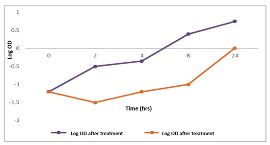 C. thouarsii extract (at concentrations ranging from 2 to 16 µg/mL) inhibited the growth cycle curve and decreased the growth in 73.5% of the tested isolates using a spectrophotometric method [15]. A representative example is shown in Figure 2.