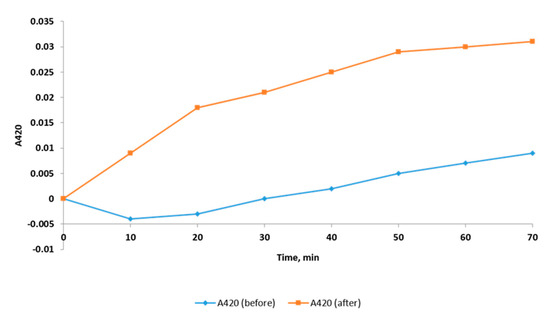 It was investigated by measuring the release of the β-galactosidase enzyme from the cytoplasm of the tested isolates using ONPG as an enzyme substrate [17]. An overnight bacterial suspension grown in nutrient broth and supplemented with 2% lactose was centrifuged, and the pellet was washed and resuspended in a solution of 0.5% NaCl. Then, 150 µL of 34 mM ONPG solution was added to 1.6 mL of the bacterial suspension. The produced ONP was detected over time via monitoring the increase in the absorbance at 420 using an ELISA reader (Sunrise Tecan, Männedorf, Switzerland).