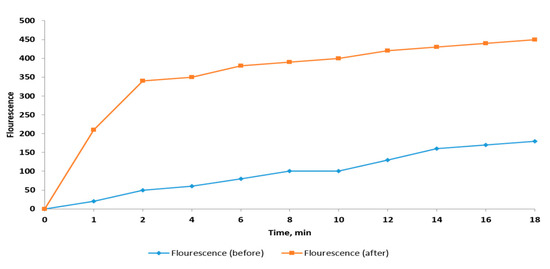 Outer membrane permeability was measured by recording the fluorescence of the hydrophobic agent 1-N-phenylnaphthylamine (NPN) using a spectrofluorophotometer [18]. The NPN fluorescence is detectable in hydrophobic environments such as the hydrophobic region of the cell membrane. As shown in Figure 5, a significant increase in the fluorescence of NPN, hence, the outer membrane permeability, was found in 58.8% of the treated isolates (concentrations of C. thouarsii extract ranged from 2 to 16 µg/mL).
