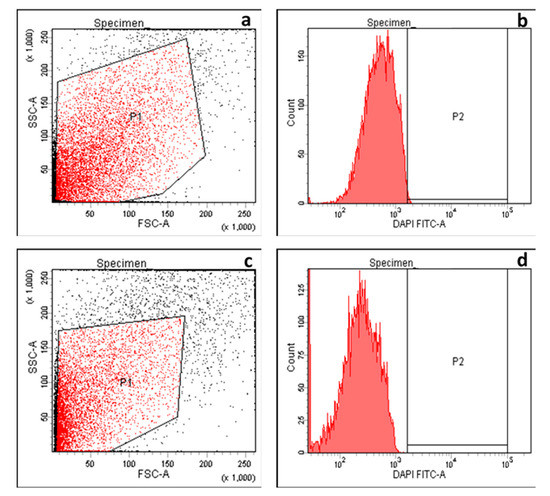 Flow cytometric dot plot and histogram showing fluorescence detected by a FACSverse flow cytometer in a representative K. pneumoniae isolate before treatment (dot plot (a) and histogram (b)) and after treatment (dot plot (c) and histogram (d)) with C. thouarsii extract (16 µg/mL).