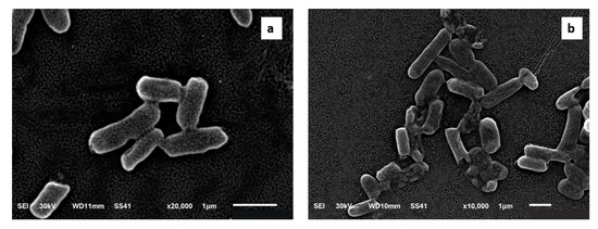 Scanning electron microscope image of a representative K. pneumoniae isolates (a) before and (b) after treatment with C. thouarsii extract (16 µg/mL).