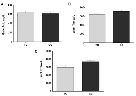 Total phenolic content (A) in green coffee extract (GC) and toasted coffee extract (TC) (results are expressed as gallic acid mg/L). Antioxidant capacity was measured by the DPPH Radical Scavenging capacity method (B) and by the FRAP method (C). Results are expressed as μmol Trolox equivalent/L.
