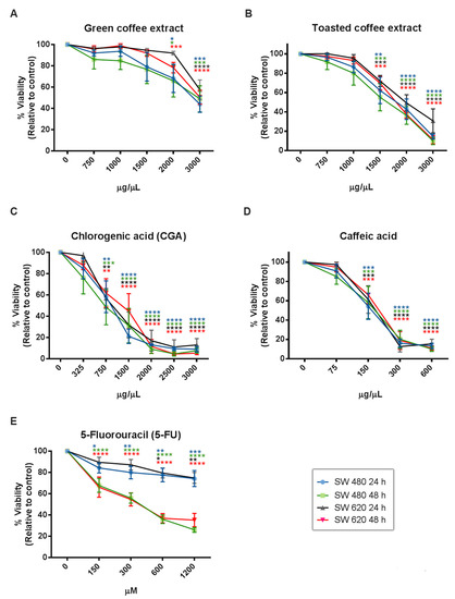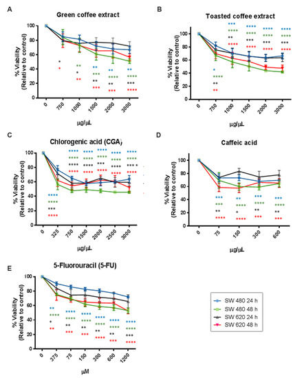 The cytotoxicity of tested compounds and coffee extracts was assessed using MTT and SRB assays. SW480 and SW620 cells were seeded in 96-well plates at 1.5 × 104 cells/well. After 48 h, cells were treated with 100 µL of fresh medium containing different coffee extracts and compounds concentrations. After 48 h of treatments, the medium was removed and replaced with a fresh medium containing 10 µL of MTT solution (5 mg/mL), and cells were incubated for 2 h at 37 °C. Then, the MTT solution was removed, and formazan crystals were dissolved with acidified isopropyl alcohol. For SRB assays, cell monolayers were fixed with 50% (wt/vol) trichloroacetic acid and stained for 30 min, after which the excess dye was removed by repeatedly washing with 1% (vol/vol) acetic acid. Next, the protein-bound dye was dissolved in 10 mM Tris base solution for OD determination. Finally, the absorbance was read at 570 nm for MTT, and 510 nm for SRB (GloMax-Multi Detection System by Promega), and the percentage of living cells was calculated by dividing the optical density (OD) of the treated cells with the (OD) from the control cells and then multiplied by 100. For each treatment, 3 replicates were evaluated in at least 3 independent experiments.