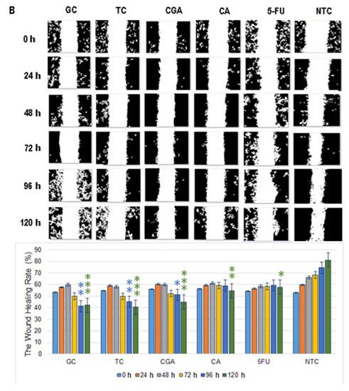 Wound healing assay revealed that the 120 h migration distance rates of both cell lines in all the treatments were significantly shorter than the NTC-control group. In SW480 cells, CGA and 5-FU treatments showed a non-migration pattern, while CA, TC, and GC treatments showed a small increment in the open wound area over time (Figure 6A).