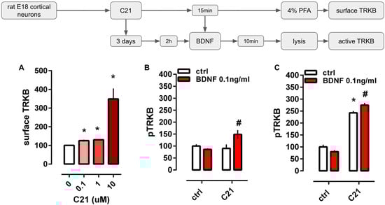 In vitro effects of C21 on TRKB surface exposure and activation. (A) Acute administration of C21 (shades of red bars, 0.1–10 μM/15 min) increased the surface exposure of TRKB in cultured cortical cells from rat embryos (n = 19–24/group). (B) Administration of C21 (10 μM/15 min) facilitated the effect of an ineffective dose of BDNF (0.1 ng/mL/10 min, red bars). (C) The longer administration of C21 (10 μM/3 days) increased pTRKB levels per se but still facilitated the effect of BDNF (0.1 ng/mL/10 min, red bars). Data expressed as mean ± SEM from ctrl/ctrl or 0 groups. * p < 0.05 from ctrl/ctrl or 0 group; # p < 0.05 from C21/ctrl (n = 8–12/group: Fisher’s LSD).
