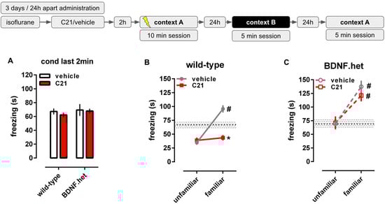 Effects of C21 in wild-type and BDNF haploinsufficient animals (BDNF.het) in contextual fear conditioning. (A) Administration of C21 (red bar, 0.3 mg/kg, intranasal) did not affect the freezing reaction at the end (last 2 min) of the conditioning session. (B) Treatment with C21 did not affect the freezing reaction in the unfamiliar context but decreased the freezing in familiar context on wild-type animals. Hatched area: mean ± SEM of the freezing time of vehicle-treated animals in the last 2 min of the conditioning session. (C) Treatment with C21 did not exert any effect in BDNF.het mice. Hatched area: mean ± SEM of the freezing time of vehicle-treated animals of each genotype in the last 2 min of the conditioning session. Data expressed as mean ± SEM of the time spent in freezing (s). * p < 0.05 from the vehicle-treated group at the same trial, # p < 0.05 from the freezing time in the unfamiliar context in the same group (n = 6–12/group).