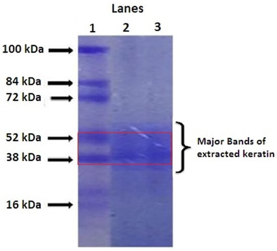 The SDS-PAGE method was used to ensure the presence of keratin, as the mixture could contain both keratins and matrix proteins. Prior to performing the electrophoresis analysis, the extracted keratin solution was subjected to dialysis and held at −80 °C for 2 days to prevent any accumulation. The extracted keratin showed a major band at the molecular weight of 52–38 kDa (Lane 3), which represents the low sulphur-containing “alpha” keratin of hair (Figure 1) as similar to the previously reported studies [19].