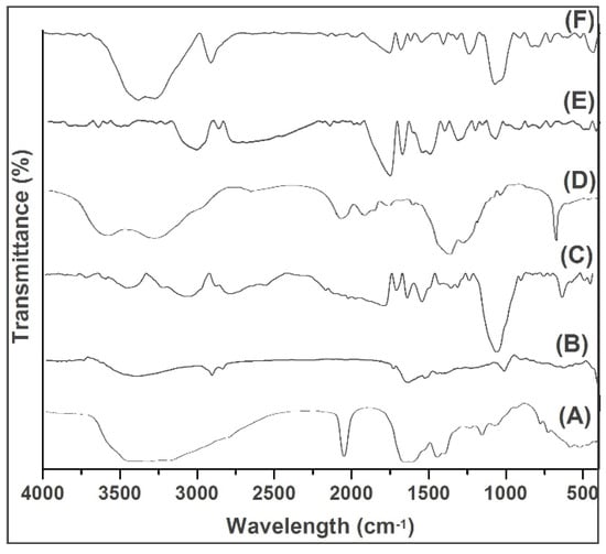 FTIR spectra of (A) Reference keratin, (B) Extracted keratin, (C) PVA, (D) GS, (E) scaffold (1:3), and (F) scaffold (1:4).