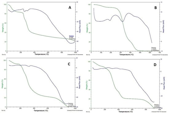 DSC (blue) -TGA (green) curves of (A) Keratin, (B) PVA, (C) GS, and (D) 1:4 composite scaffold.