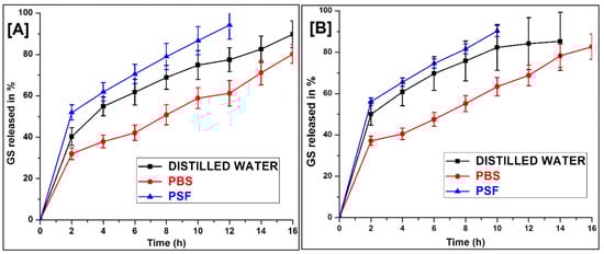 The GS release from the composite scaffold in PSF, water and a PBS (pH 7.4) that lasted for up to 16 h is shown in Figure 6. There was an immediate release of GS followed by a slow-release observed with both scaffolds. The GS release was found to be high in the order of PSF > water > PBS. In the case of PSF, approximately 90% and 86% of the GS had been released within 10 h, whereas it took 14 h and 16 h for the water and the PBS scaffold 1:3 (Figure 6A) and 1:4 (Figure 6B), respectively, after which degradation of the scaffold structure occurred. The study revealed that GS release is influenced by the fluid environment present in the dissolution medium. The immediate drug release percentage may help provide a high drug concentration at the wound site, prevent infection, and help speed up the healing process, whereas sustained-release maintains GS at the wound site for a long period [31].