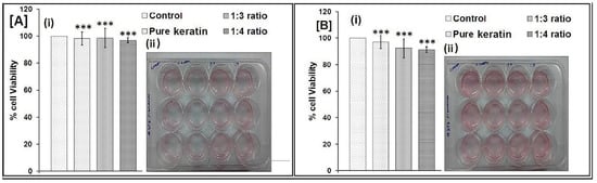 NIH 3T3 cells were selected for the study because they are easy to preserve and are well known in cell-scaffold interaction studies [33]. The wound healing properties conclude that the keratin and 1:3 and 1:4 scaffold on NTH 3T3 cell lines from MTT-reduction assay of the percentage of viable cells is shown in Figure 7. From the study, the viable cells were rises with the reductions in hours. The behaviour of the composite scaffold on fibroblast cell lines by means of colour formation in terms of optical density at 550 nm is shown in Figure 7. The increase in the intensity of formazan product colour indicates an increase in cell counts in number. An MTT assay showed that there was more than 90% cell viability, as calculated from the OD values obtained after 24 (Figure 7(Aii)) and 48 h (Figure 7(Bii)) of culturing the plates.