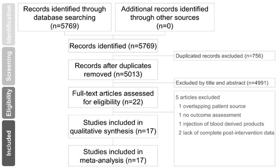 We identified 5769 citations in the literature search from the electronic databases, PubMed, EMBASE, and Scopus. No additional articles were extracted manually from any of the reference lists for the analysis. A total of 756 articles were removed due to duplication. We later screened the titles and abstracts of the remaining studies and retained 22 articles for full-text assessment. One study [28] was excluded due to an overlapping patient source, one study protocol [29] was excluded due to no outcome assessment, one study [30] was excluded due to use of autologous blood-derived products and two studies [31,32] were excluded due to a lack of complete post-intervention data. The final meta-analysis included 17 articles (Figure 1) comprising 595 participants. Average age, stroke duration, and a summary of the retrieved trials are listed in Table 1.