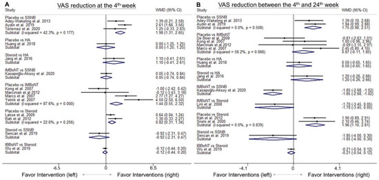 Forrest plots for the available direct comparisons between pairs of treatments among the included studies regarding the effects of VAS reduction (A) at the 4th week and (B) between the 4th and 24th weeks after interventions. BoNT, botulinum toxin; HA, hyaluronic acid; IB, intra-bursal; IM, intra-muscular; SSNB, suprascapular nerve block; VAS, visual analogue scale; WMD, weight mean difference.