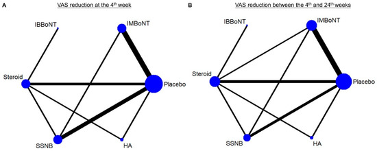 Network plots of injection therapies in terms of the VAS reduction (A) at the 4th week and (B) between the 4th and 24th weeks. The nodes indicate the types of injections being compared and the edges indicate available direct comparisons between pairs of treatments. BoNT, botulinum toxin; HA, hyaluronic acid; IB, intra-bursal; IM, intra-muscular; SSNB, suprascapular nerve block; VAS, visual analogue scale.
