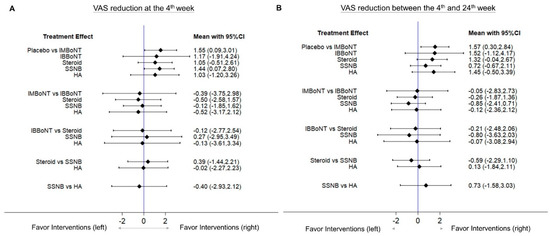 Forest plots of the network estimates derived from all the direct and indirect pairwise comparisons of the treatment effects in terms of VAS reduction (A) at the 4th week and (B) between the 4th and 24th weeks after interventions. BoNT, botulinum toxin; HA, hyaluronic acid; IB, intra-bursal; IM, intra-muscular; SSNB, suprascapular nerve block; VAS, visual analogue scale.