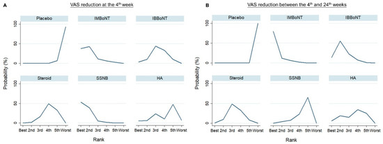 Ranking probabilities for different injection therapies in terms of VAS reduction (A) at the 4th week and (B) between the 4th and 24th weeks. The plot demonstrates the probabilities of being the best, second best, third best, fourth best, fifth best, and worst among the six injection treatments. BoNT, botulinum toxin; HA, hyaluronic acid; IB, intra-bursal; IM, intra-muscular; SSNB, suprascapular nerve block; VAS, visual analogue scale.