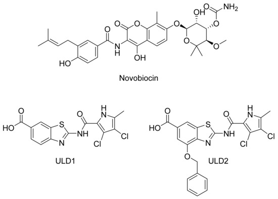 Numerous studies towards the development of new antibacterial agents have involved the design of novel ATP-competitive inhibitors of DNA gyrase [2,3,4,5,6,7,8,9,10]. DNA gyrase is an attractive target for antibacterial drug discovery because it plays an important role in the modulation of DNA topology during replication and is vital for the survival of the bacterial cell [10]. It is a heterotetramer that is composed of two catalytic GyrA subunits and two GyrB subunits with ATPase activity. While GyrA subunits are targets of the fluoroquinolone class of antibiotics, there is no representative GyrB inhibitor in the clinic. The only approved drug from the latter class used therapeutically in the past was novobiocin (Figure 1), which was withdrawn from the market because of its side effects and resistance development [9].