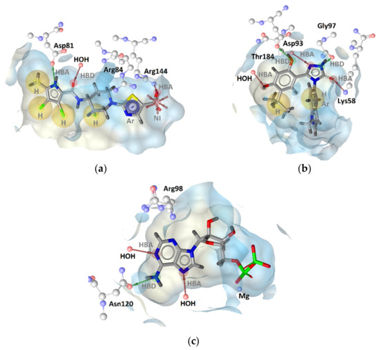 Comparison of crystal structures of (a) GyrB (PDB entry: 3TTZ) in complex with pyrrolamide-based inhibitor, (b) Hsp90 (PDB entry: 3TUH) in complex with inhibitor ganetespib, and (c) TopoII (PDB entry: 4R1F) in complex with ADP. The interaction features were derived using LigandScout 4.4 [29]. Hydrophobic features (H) are shown as yellow spheres, negative ionizable (NI) as a red star, aromatic ring (Ar) as a blue disc, hydrogen-bond donors (HBD) as green arrows, and hydrogen-bond acceptors (HBA) as red arrows.
