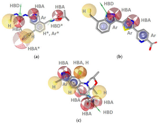 Three of the best performing GyrB inhibitor ligand-based models resulting from clustering a dataset of 221 very active GyrB inhibitors: (a) LB-GyrB-Model-5m; (b) LB-GyrB-Model-4; (c) LB-GyrB-Model-6. The pharmacophore features are as follows: hydrophobic (H, yellow spheres), aromatic (Ar, blue disc), hydrogen bond donor (HBD, green arrow), and hydrogen bond acceptor (HBA, red sphere). Optional pharmacophore features are marked with *.