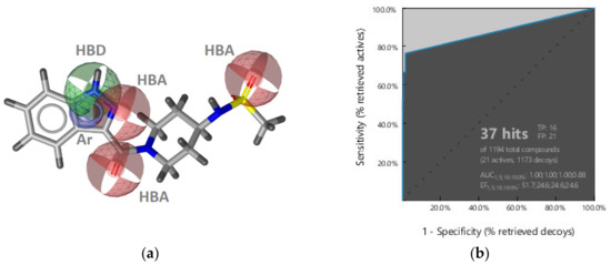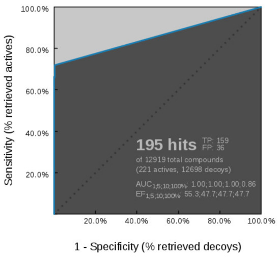 In addition, for each active compound in the datasets, a set of 50 decoys was generated using the DUD-E (database of useful docking decoys) server [43]. The 3D-pharmacophore models were trained using their respective active and inactive datasets and tested using the respective active and decoy datasets. Receiver operating characteristic (ROC) curves were generated to compare the VS performance of the generated models. Models with steep curves showing a high rate of retrieval of true positive (TP), and low rate of false-positive (FP) compounds, an area under the curve (AUC) close to 1, and high enrichment factors (EF) were selected for the compound in silico activity profiling experiments involving the respective targets.