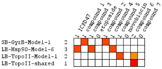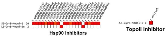 Heatmaps were obtained after screening 649 of the most potent Hsp90 inhibitors (Kd < 100 nM) and 21 TopoII inhibitors using 5 GyrB 3D-pharmacophore models. SB-GyrB-Model-2 retrieved both Hsp90 and TopoII inhibitors, and LB-GyrB-Model-5m retrieved only 2 Hsp90 inhibitors. None of the other GyrB models retrieved compounds from the Hsp90 and TopoII datasets.
