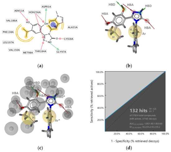 3D-structure-based interactions derived from a dihydropyridopyrimidinone Hsp90 inhibitor (PDB ID: 4U93): (a) 2D-depiction with binding site interaction partners and (b) 3D-depiction the SB-pharmacophore model with the ligand; (c) The refined SB-Hsp90-Model-2, (d) Receiving operating characteristic (ROC) (curve shown in blue) from virtually screening 37,814 compounds (649 Hsp90 actives and 37,165 generated decoys) with the refined SB-Hsp90-Model-2. TP = true positives; FP = false positives; AUC = area under the curve; EF = enrichment factor. Displayed pharmacophore features are: hydrophobic (H, yellow spheres), aromatic ring (Ar, blue disc), hydrogen bond donor (HBD, green arrow), and hydrogen bond acceptor (HBA, red arrow). Optional pharmacophore features are marked with *.